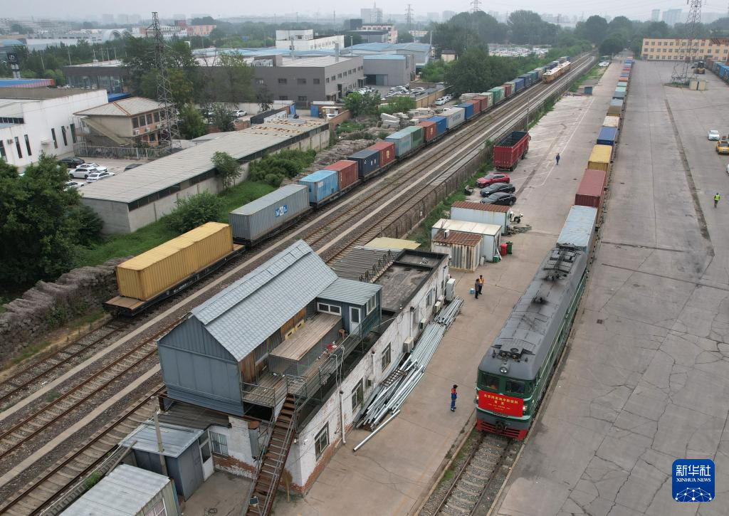 6月30日,北京至阿塞拜疆巴庫的跨里海中歐班列??吭谖挥诒本┦蟹可絽^的北京國際陸港等待發車(無人機照片)。