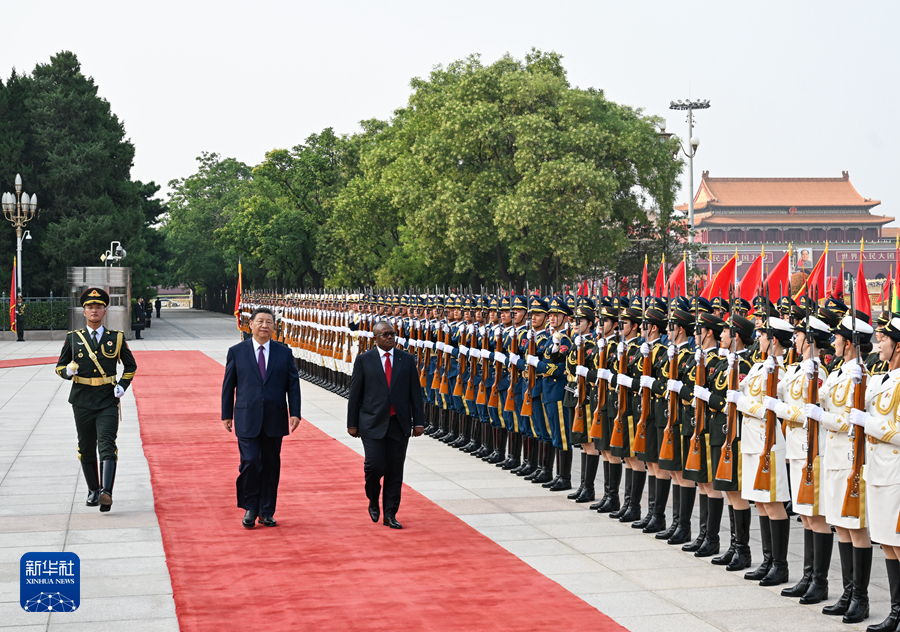 ??恩巴洛抵達(dá)時(shí),禮兵列隊(duì)致敬。兩國(guó)元首登上檢閱臺(tái),軍樂(lè)團(tuán)奏中國(guó)和幾內(nèi)亞比紹兩國(guó)國(guó)歌,天安門(mén)廣場(chǎng)鳴放21響禮炮。恩巴洛在習(xí)近平陪同下檢閱中國(guó)人民解放軍儀仗隊(duì),并觀(guān)看分列式。